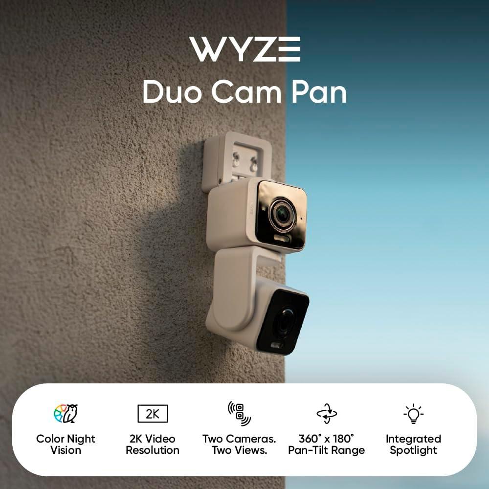 Experience versatile security with the Wyze Duo Cam Pan. Its dual 2K lenses and 360°×180° pan-tilt deliver ultra-clear coverage of two separate areas indoors and outdoors at the same time. Motion Tracking automatically locks onto movement—whether friendly or suspicious—while Color Night Vision captures vivid detail in low-light environments up to 25× darker than traditional cameras. Enjoy smooth, whisper-quiet operation, clear two-way audio, and flexible mounting options for shelves, tabletops, or walls. With the Wyze Duo Cam Pan, you get seamless coverage, smart tracking, and reliable protection, day or night.