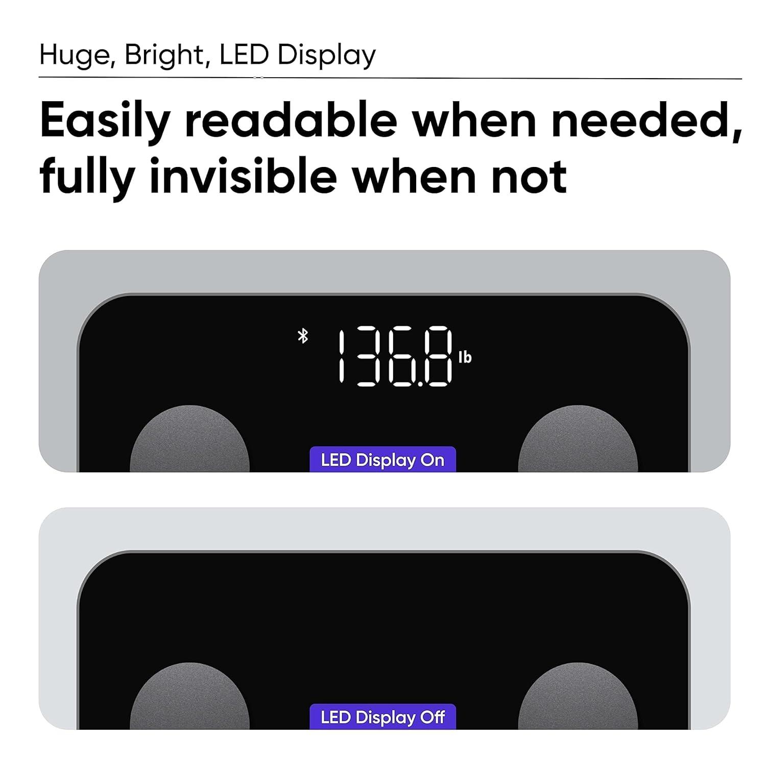 ADVANCED DESIGN – An ITO coating of the tempered glass used on Wyze Scale X gives highly accurate body composition measurements wherever you stand. You can see your weight and body fat measurement over the scale's luxurious digital LED screen.